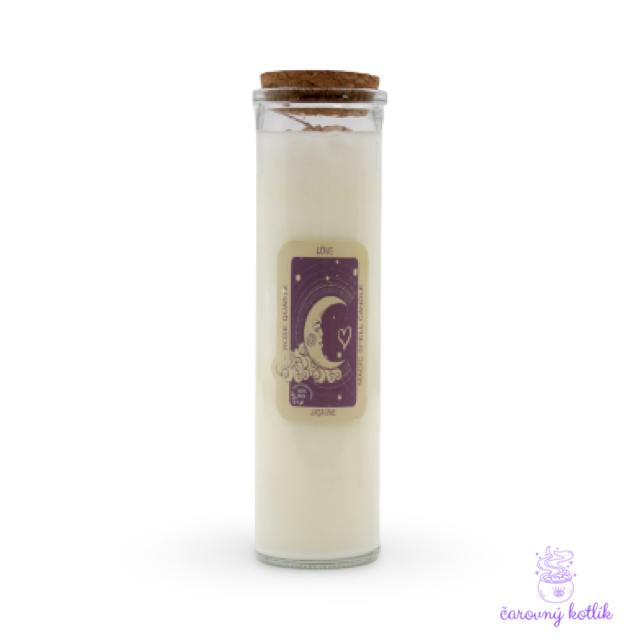 Privolajte do svojho života lásku. Táto čarovná sviečka s magickou silou transformačného ohňa je ideálnym pomocníkom do Vášho rituálu, či na meditáciu. Jazmínová vôňa a kamene ruženínu násobia energiu sviečky a pomáhajú tak naplniť zámery venované láske.